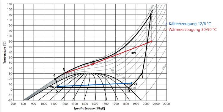 Besonders der transkritische Bereich lässt sich im T-S Diagramm deutlich darstellen. Auf der Abszisse wird die Entropie S und auf der Ordinate die Temperatur aufgezeigt. Im Bild 3 ist der Prozess einer Wasser-Wasser-Wärmepumpe dargestellt. Auf der Verdampferseite wird Kaltwasser von 12 auf 6°C gekühlt und dies als Wärmequelle genutzt. Nach der Verdichtung des Kältemittels auf 120 bar und einer Endtemperatur von 140°C im transkritischen Bereich erfolgt die Wärmeabgabe über einen Gaskühler auf die Heizungswasserseite mit 30°C/90°C.