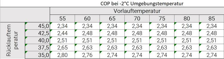 Wie bereits erläutert ist R744 besonders effizient, wenn eine niedrige Rücklauftemperatur erreicht wird. Die Vorlauftemperatur hat hier einen deutlich geringeren Einfluss. Dies ist ein riesiger Unterschied zu den herkömmlichen Kältemitteln welche subkritisch Betrieben werden (z.B. R1234ze). Um dies zu verdeutlichen, wurden in Tabelle 1 die Leistungszahlen einer Luft-Wasser-Wärmepumpe bei -2°C Umgebungstemperatur gegenübergestellt. Bei 35°C Rücklauftemperatur und 55°C Vorlauftemperatur ist der COP 2,8, bei 30 K höherer Vorlauftemperatur beträgt er 2,74, die Reduzierung ist minimal.