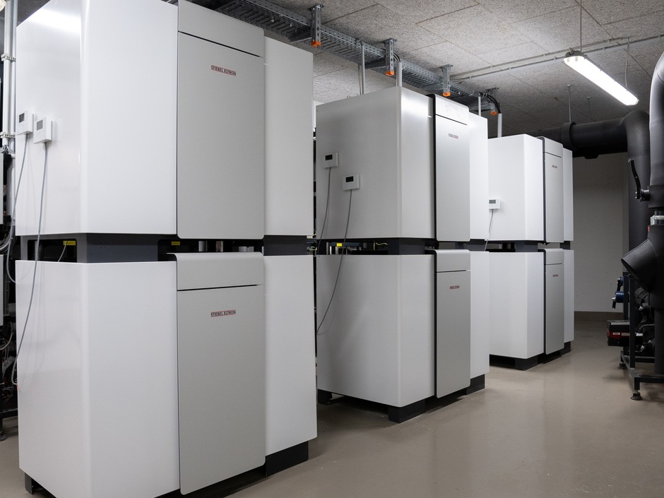 Zusätzlich zur Wärmepumpenanlage wurden zwei Gas-Brennwertkessel installiert, die während der EVU-Sperren oder im Falle einer Havarie der Abwasserleitung einspringen. Die Warmwasserbereitstellung erfolgt dezentral über Durchlauferhitzer von Stiebel Eltron.