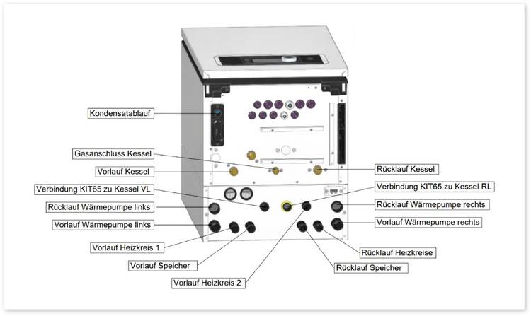 Der Zeitaufwand, zusätzlich zur Kesselanbringung, beträgt etwa 30 Minuten und kann von einer Person ohne gesonderte Schulung, nahezu im Alleingang, erledigt werden. Das Verbindungselement Kit 65 wiegt 21 kg und passt mit Maßen von 450 x 760 x 175 mm (HBT) exakt hinter den Gas-Kessel. Im Inneren des Gerätes befinden sich eine elektronisch geregelte Hocheffizienzpumpe Grundfos UMP 4, ein Schnellentlüfter sowie ein 3-Wege-Ventil. Zur Entkopplung der Volumenströme ist eine gedämmte Hybrid-Hydraulikeinheit integriert.