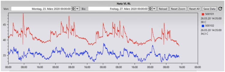 Das Bild zeigt den Verlauf der Netztemperaturen (rot = Vorlauf, blau = Rücklauf) eines gleitend betriebenen Nahwärmenetzes. Die Temperaturen im Netz gehen nachts nach oben, da der Heizbedarf der Gebäude steigt. Tagsüber sinkt die Vorlauftemperatur, da es weniger Wärmebedarf gibt. So werden in kalten, intelligenten Nahwärmenetzen die Strahlungsverluste minimiert und die Effizienz des Netzes wird damit deutlich gesteigert.