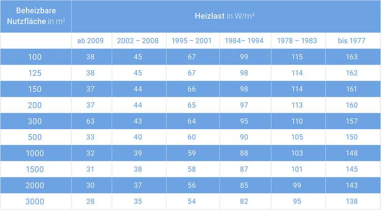 Eine andere Möglichkeit wird durch die DIN EN 15378 gegeben, in Abhängigkeit von der beheizbaren Nutzfläche und dem Gebäudebaujahr eine Heizlast je m² Wohnfläche zu ermitteln. Aber auch diese Methode kann stark fehlerbehaftet sein, da keinerlei Berücksichtigung des Nutzerverhaltens und mögliche durchgeführte Sanierungsarbeiten.