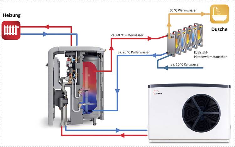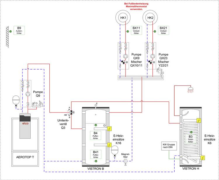 Gegeben ist ein Mehrfamilienhaus mit sechs Wohneinheiten. Drei Wohneinheiten sind für ein Paar, die anderen drei Wohneinheiten für eine dreiköpfige Familie ausgelegt. Jede Wohneinheit verfügt über eine normale sanitäre Ausstattung mit Dusche, keine Schwallbrausen sind verbaut. Die Heizlast wurde mit 15 kW ermittelt, Aufstellort ist 76131 in Karlsruhe. Im Gebäude ist nur Fußbodenheizung verbaut, die Vorlauftemperatur im Auslegungspunkt beträgt 35 °C. Mit dem EVU wurde ein Wärmepumpentarif abgeschlossen und maximal 2 h Sperrdauer am Tag vereinbart. Der Gebäudeeigentümer wünscht eine monovalente Betriebsweise. Monovalent bedeutet, dass die Wärmepumpe der alleinige Wärmeerzeuger ist und die volle Heizleistung bei der entsprechenden Normaußentemperatur erbringt.