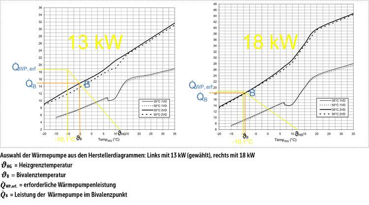 Bei dem Hersteller unseres Vertrauens finden wir bei der Normaußentemperatur von -10,1 °C nun zwei Modelle: Einmal mit 18 kW und einmal mit 13 kW. Die größere Wärmepumpe ermöglicht fast den vom Bauherrn gewünschten monovalenten Betrieb, die kleinere Wärmepupe kann monoenergetisch betrieben werden. Bis zum Bivalenzpunkt von -5 °C Außentemperatur erbringt die Wärmepumpe die notwendige Heizlast, dann kommt der Heizstab unterstützend hinzu.