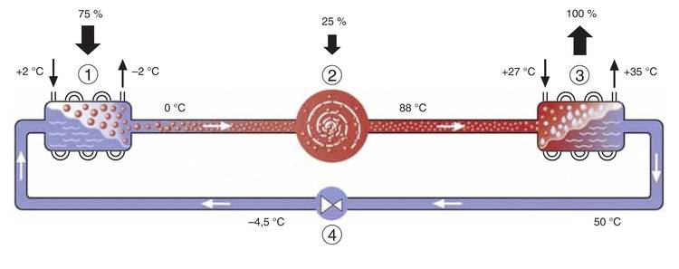 Der Verdampfer (1) enthält ein flüssiges Arbeitsmittel, ein sogenanntes Kältemittel, mit sehr niedrigem Siedepunkt. Das Kältemittel hat eine niedrigere Temperatur als die Wärmequelle, in diesem Fall also die Außenluft. Die Wärme strömt also von der Wärmequelle an das Kältemittel. Das Kältemittel erwärmt sich dadurch bis über seinen Siedepunkt, verdampft und wird vom Kompressor angesaugt.