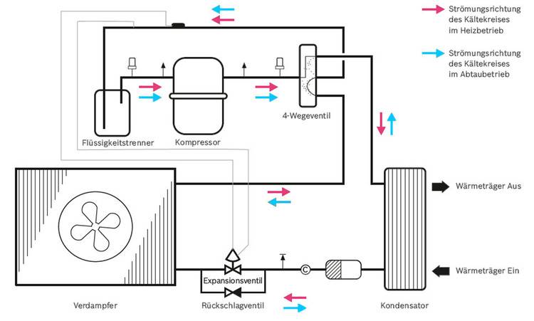 Für den Abtauprozess wird im Kältekreislauf ein Vier-Wege-Ventil installiert. Dieses Vier-Wege-Ventil ermöglicht es, den Kältekreislauf umzukehren, so dass dem Kältekreislauf Wärmeenergie aus dem Heizsystem zugeführt werden kann.