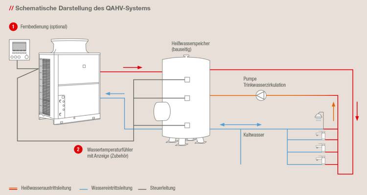 Für die effiziente Wärme- sowie Warmwasserversorgung hat Mitsubishi Electric neben der Ecodan-Wärmepumpenkaskade mit einer Heizleistung bis zu 138 kW die neue Heißwasser-Wärmepumpe QAHV im Programm, die Warm-/Heißwasser erzeugt. Sie arbeitet als Monoblockgerät mit dem Kältemittel R744 (CO2). Bei einem COP von bis zu 3,88 erzeugt das System auch bei Außentemperaturen von –25 °C warmes Wasser mit maximal 90 °C. Mit Schallemissionen von 56 dB(A) ist die Wärmepumpe sehr leise. Für hohe Warmwasserleistungen ist die Heißwasser-Wärmepumpe mit Scroll-Inverter-Verdichtern mit Flash-Injection ausgestattet. Ein großes Delta-t zwischen Vor- und Rücklauftemperatur des Wassers steigert die Effizienz des Gesamtsystems. Durch die hohe Warmwassertemperatur ist es möglich, die Kapazität des Warmwasserspeichers kleiner zu dimensionieren. Die maximale Wärmeleistung erreicht 40 kW. Pro Minute können bis zu 11,9 l Wasser mit 65°C erzeugt werden. Der Arbeitsbereich erstreckt sich von –25 bis 43 °C.