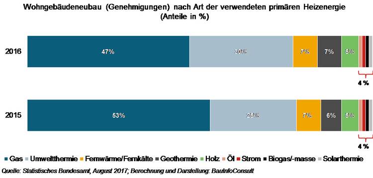 Dagegen konnten die drei Klassiker des Heizens mit regenerativen Energien – Umweltthermie, Geothermie und Holz – mit einem Anteil von insgesamt 42% aller genehmigten Neubauten in 2016 insgesamt betrachtet einen deutlichen Sprung nach vorne machen. Insbesondere die Umweltthermie – bei der Luft oder Wasser die Wärme entzogen wird – kann sich von den erneuerbaren Energien als Sieger sehen: 30% der genehmigten Wohngebäude wurden 2016 mit dieser umweltfreundlichen Technik ausgestattet – ein sattes Plus von 5 Prozentpunkten gegenüber dem Vorjahreszeitraum. Dabei zeigen die statistischen Zahlen relativ deutlich, dass die jüngste Marktschwäche des Gases besonders durch diese Zuwachsrate bei der Umweltthermie verursacht wurde.