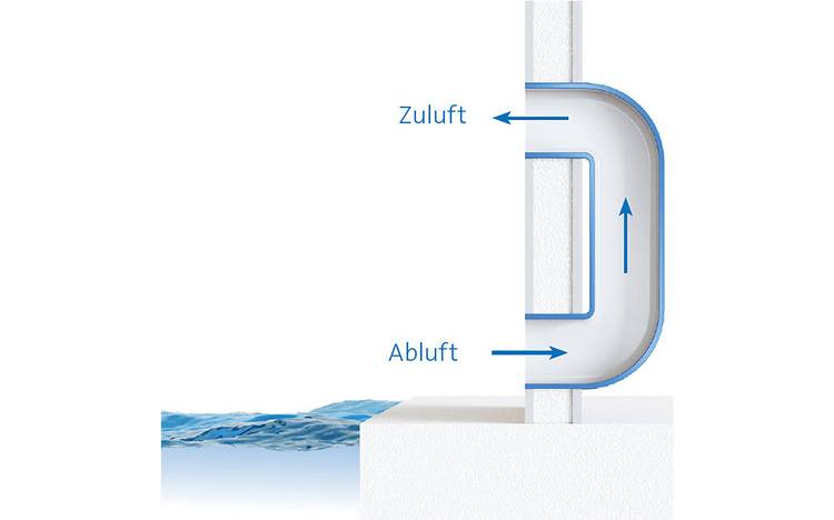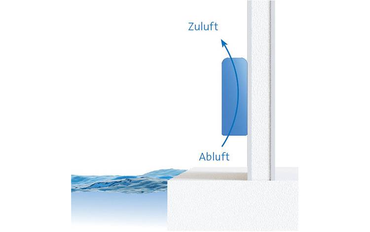 Der Entfeuchter wird über zwei Kanäle durch die Wand mit der Schwimmhalle verbunden, wodurch innerhalb der Schwimmhalle nur die dezenten Zu- und Abluftgitter zu sehen sind. Somit wird das architektonische Bild der Schwimmhalle nicht gestört und der betriebsbedingte Schalleintrag wird minimiert.