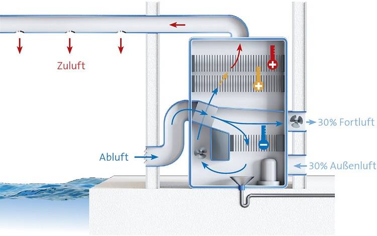 Am Verdampfer des Kältekreises wird die in der Luft enthaltene Feuchtigkeit auskondensiert und das Kondensat über den Abfluss abgeführt. Ein Teil des Luftstroms wird dann über einen Ventilator nach außen geführt. Der restliche Luftstrom wird mit einem Anteil Außenluft gemischt und anschließend auf der anderen Luftseite über den Kreuzstrom-Wärmeübertrager geleitet. Dort wird der Mischluftstrom durch die warme Luft aus der Schwimmhalle vorerwärmt. Falls notwendig, erfolgt eine weitere Erwärmung über ein nachgeschaltetes Warmwasser-Heizregister. Bild 4 verdeutlicht vereinfacht die Funktionsweise eines derartigen Gerätetyps.