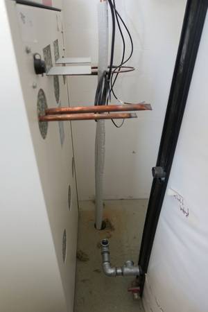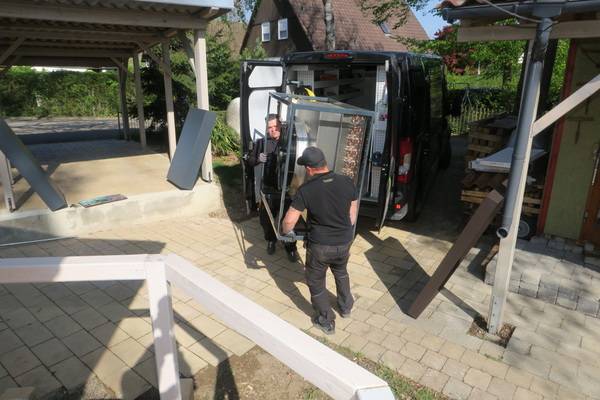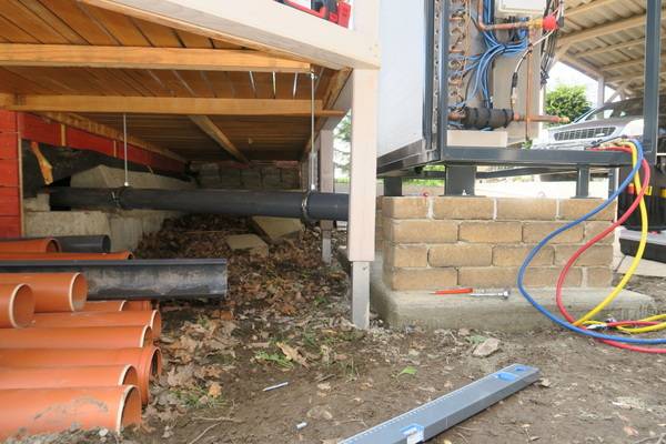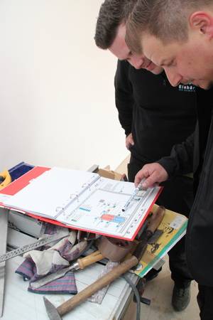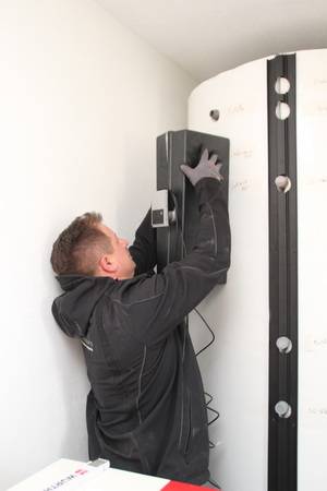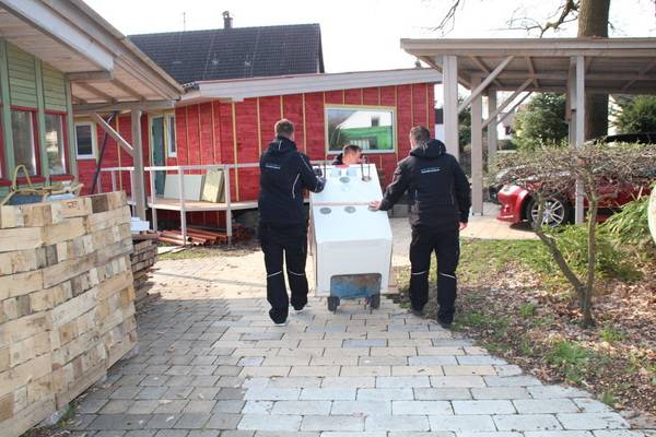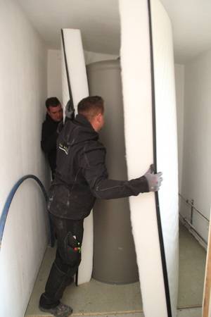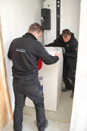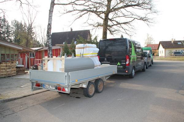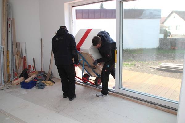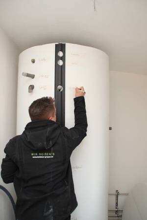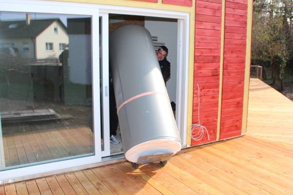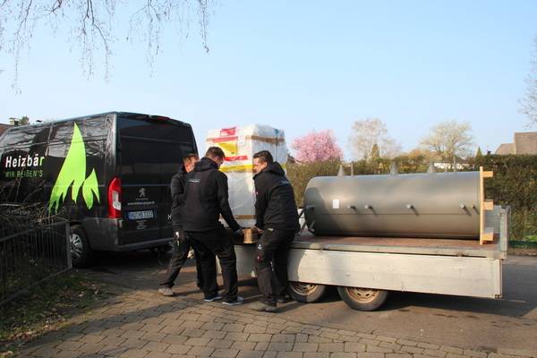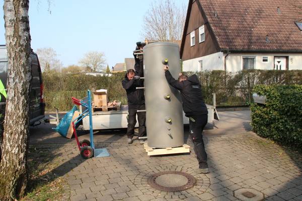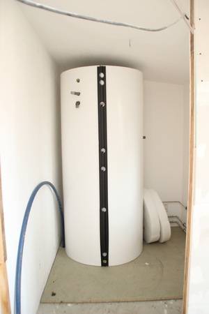 Auch beim Heizsystem der Objekte des bau- und planungslustigen Designers nimmt Holz eine zentrale Funktion ein: Setzte der Bauherr in den 1990er Jahren zur Wärmeversorgung des ersten holzfasergedämmten Holzständerhauses auf einen großen, Stückholz befeuerten Grundofen in Kombination mit einer mit Flüssiggas (LPG) betriebenen Zentralheizung mit zwei separaten Kreisläufen für Heizkörper und Fußbodenheizung, besteht das Heizkonzept beim jetzt abgeschlossenen Neubauprojekt aus einer besonders effizienten Luft-Wasser-Wärmepumpe (maximaler COP durch direkte Kondensation im Speicher) sowie einem modernen, mit 11 kW Nennwärmeleistung (NWL) ausreichend starken wassergeführten Kaminofen, der mit 7,9 kW rund Zweidrittel der erzeugten Wärmeenergie in den Pufferspeicher überführt. Ein Drittel geht über die Ofenhaut in den Aufstellraum. Selbstverständlich ging dem eine fundierte Anlagenplanung mit Heizlastberechnung nach DIN EN 12831 durch ein Planungsbüro voraus. Dann konnte es losgehen und die Arbeiten begannen mit der Anlieferung und Aufstellung des Pufferspeichers.