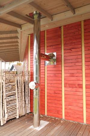 Auch wenn die hier installierte Luft-Wasser-Wärmepumpe im Prinzip allein den Neubau ganzjährig mit Energie für Heizung und Brauchwasser versorgen könnte, war die Möglichkeit der ergänzenden Holzbefeuerung des Objekts für den Bauherrn einfach zu verlockend. Und weil seinerzeit von der KfW im Rahmen eines Förderprogramms für KfW40-Neubauten ein günstiges Darlehen zu 0,75% Verzinsung angeboten wurde, das der Bauherr in Höhe von 100.000 EUR in Anspruch nahm und im Programm auch noch ein Abzug in Höhe von 15.000 EUR gewährt wurde, wenn zusätzlich ein weiteres regeneratives Heizsystem (hier Kaminofen mit Wassertasche) installiert würde, fiel die Entscheidung für den Ofen leicht.
