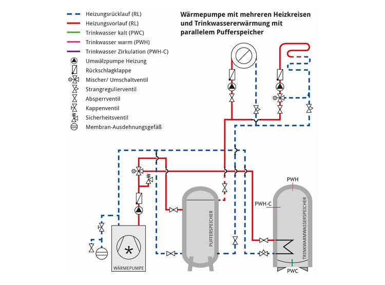 - Berechnungsbeispiele zur Auswahl der Wärmepumpe und Dimensionierung der Bauteile, zum Heizwärme- und Trinkwarmwasserbedarf und zur Dimensionierung von Speichern