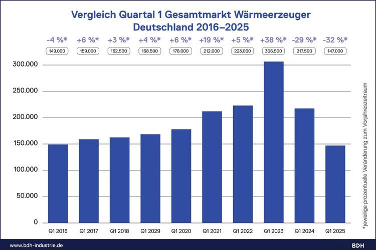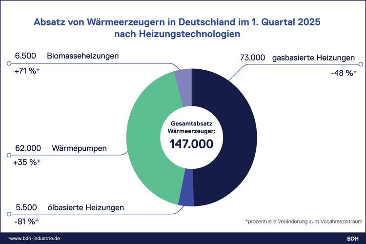 Der Bundesverband der Deutschen Heizungsindustrie (BDH) hat seine Absatzstatistik für das 1. Quartal 2025 vorgelegt. Die Zahlen erfassen sämtliche am Markt verfügbaren heiztechnischen Lösungen und Komponenten.
