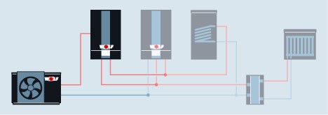 • Unterschiedliche Systemtempertaturen, Massenströme und Anforderungen an die jeweilige Systemspreizung der beiden Wärmeerzeuger