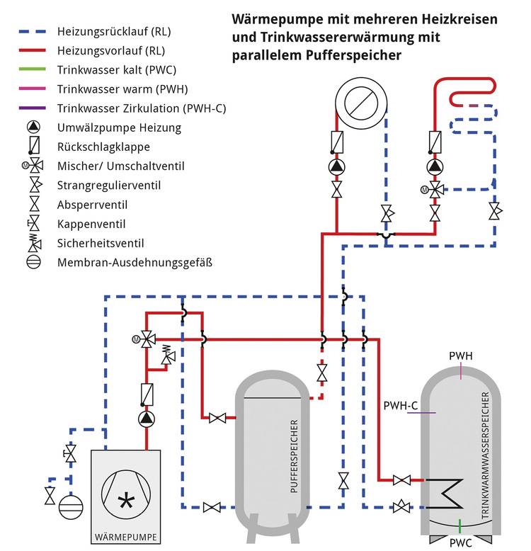 Die Rohrnetzberechnung und die Auslegung der Komponenten für Wärmepumpen werden nach anerkannten Regeln durchgeführt. Für die hydraulischen Schaltungen bieten die Wärmepumpenhersteller Schemata an. Einige geeignete Hydrauliken hat der BWP in seinem Leitfaden Hydraulik beschrieben (Bild 2).