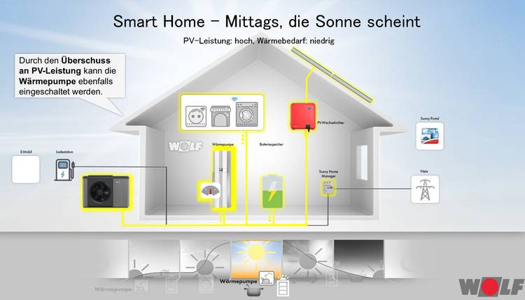 Bei Wolf werden auf diesem Weg mehrere Daten an den Energiemanager übermittelt: Wann die Wärmepumpe bereit ist und ihr Betrieb eingeplant werden darf, außerdem die Mindesteinschaltzeit sowie die maximale und aktuelle Leistungsaufnahme. Wenn alle Anforderungen des Energiemanagers erfüllt sind, kann der Heizbetrieb mit PV-Strom starten.