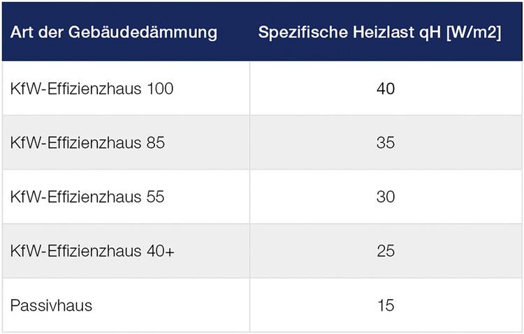 Für den Neubau ist die Heizlast grob über die zu beheizende Fläche und den spezifischen Wärmebedarf ermittelbar. Der spezifische Wärmeleistungsbedarf ist abhängig von der Wärmedämmung des Gebäudes (Bild 2). Als Formel lässt sich Gleichung 3 verwenden. Die Heizlast bei einem Haus mit 150 m2 zu beheizender Fläche und Wärmedämmung nach KfW-55-Standard mit qh =30 W/m2 beträgt damit 4,5 kW.