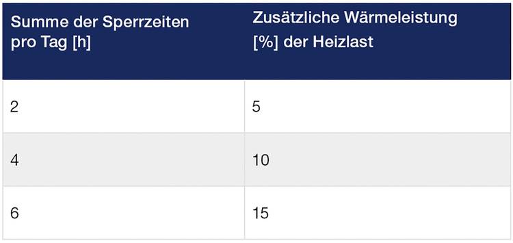 Bei monovalentem und monoenergetischem Betrieb muss die Wärmepumpe entsprechend größer dimensioniert werden, um trotz der Sperrzeiten den erforderlichen Wärmebedarf eines Tages decken zu können. Weil in der Praxis nie alle Räume beheizt und die tiefsten Außentemperaturen nur selten erreicht werden, ist jedoch nur eine relativ geringe Mehrleistung zu kalkulieren: Es hat sich bewährt, die Wärmepumpe zwischen 5% (bei zwei Sperrstunden) und 15% (sechs Sperrstunden) größer zu dimensionieren (Bild 4).