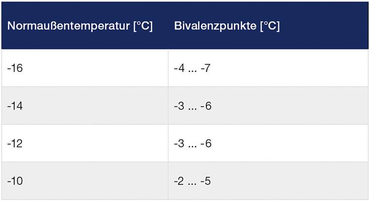 Zur Auslegung einer Wärmepumpe für die bivalente Betriebsweise ist es wichtig, den Bivalenzpunkt zu bestimmen. Die Außentemperaturen in Deutschland sind abhängig von den örtlichen klimatischen Bedingungen. Weil durchschnittlich jedoch nur an etwa 20 Tagen im Jahr eine Außentemperatur von unter −5 °C herrscht, ist auch nur an wenigen Tagen im Jahr ein paralleles Heizsystem, beispielsweise ein Gas-Brennwertgerät, zur Unterstützung der Wärmepumpe erforderlich. In Deutschland empfehlen sich die Bivalenzpunkte nach DIN EN 12 831 (Bild 6).