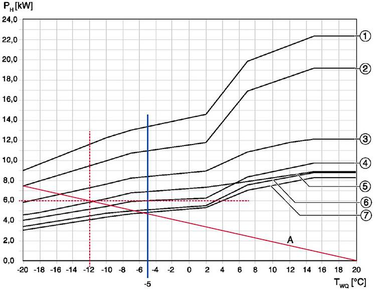 Zur Auswahl einer geeigneten Wärmepumpe wird nun die Gebäudekennlinie [A] eingetragen – vereinfacht als Gerade zwischen der ermittelten erforderlichen Leistung am Normauslegungspunkt (im Beispiel − 12 °C, 6 kW) und einer Heizleistung von 0 kW bei 20 °C. Wenn der Schnittpunkt der Gebäudekennlinie mit einer Heizleistungskurve in der Nähe der vorgesehenen Bivalenztemperatur (zum Beispiel −5 °C) liegt, kann die dazugehörige Wärmepumpe eingesetzt werden.