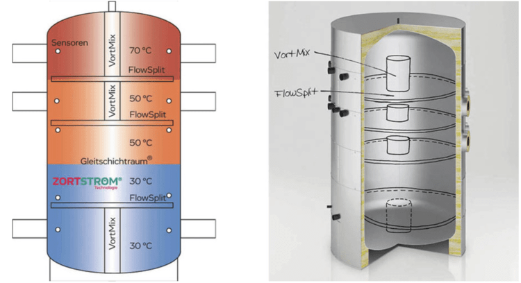 Das Zortström-Speicherkonzept realisiert eine exakte Temperaturtrennung in beliebig vielen Temperaturschichten. Der Vortmix vermischt in der Stufe das ankommende und das vorhandene Wasser. Die Flowsplit-Einheit stellt die zuverlässige Trennung der Temperaturschichten sowie den strömungsberuhigten Wasseraustausch zwischen den Stufen sicher.