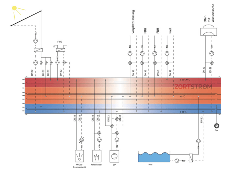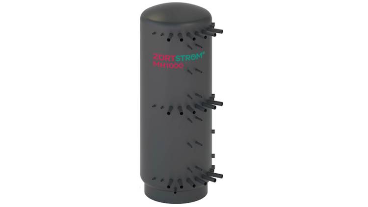 Die ursprünglich für große Wärme- und Kältebedarfe entwickelte Technologie ist seit Kurzem in Serie als Speicherzentrale Zortström MH1000 für kleinere und mittlere Leistungsabfragen bis circa 30 kW Heizlast (mit Zusatzpuffer bis 100 kW) verfügbar. Die kompakte, steckerfertig vorkonfektionierte Verteillösung – bedarfsweise mit anpassbarem Frischwassermodul und Heizkreismodulen – besteht aus zwei internen Puffern und arbeitet mit vier ansteuerbaren Temperaturstufen.