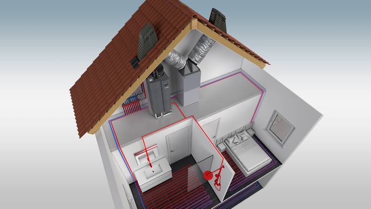 Dabei wird die Wärmepumpe in einem Raum im Keller des Gebäudes untergebracht, die Umgebungsluft als Quelle für die Primärenergie zieht das Gerät durch eine Öffnung in der Außenwand. Eine zweite Öffnung dient als Luftauslass. „Das hat den Vorteil, dass wir gerade in eng bebauten Siedlungen die Geräuschemissionen auf ein absolutes Minimum reduzieren und außen keinen Platz belegen“, erklärt Christian Dyroff. „Die Effizienz der Wärmepumpe bleibt davon unberührt.“