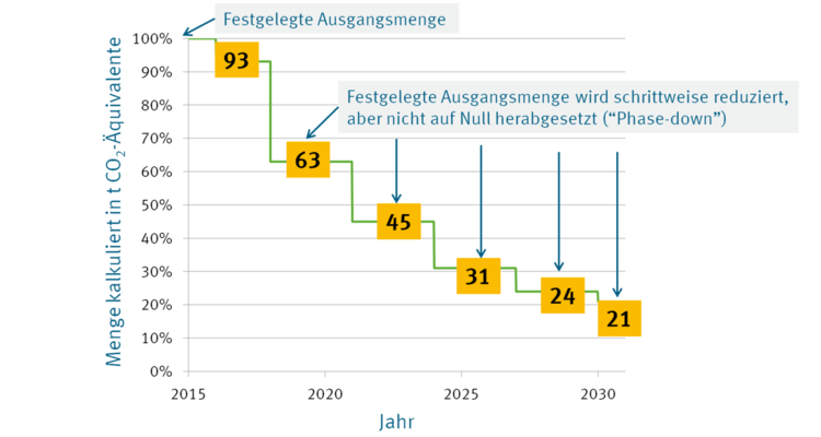 Ziel ist, das CO2-Äquivalent bis zum Jahr 2030 auf 21 Prozent zu senken (Bezugsmenge ist der EU-weite Jahresdurchschnitt von 2009 bis 2012). Hinzu kommen zusätzliche Verbote, in bestimmten Einsatzgebieten weiterhin HFKW-Kältemittel zu verwenden. Fachleute gehen davon aus, dass diese schrittweise Mengenreduktion, der sogenannte F-Gase Phase-Down und die damit zusammenhängende Verknappung an Kältemitteln mit hohem GWP zu enormen Preissteigerungen und technischen Verwerfungen am Kältemarkt führen wird. Von der Teuerung sind insbesondere Geräte und Anlagen betroffen, die regelmäßig gewartet werden müssen.