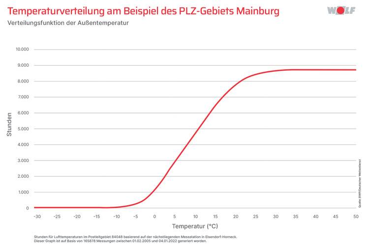 Und jetzt kommt mit Blick auf die Jahrestemperaturen der zweite Aspekt ins Spiel: Diese besonders niedrigen Temperaturen werden pro Jahr nur an nur sehr wenigen Stunden erreicht. Dies zeigen standortgenaue Temperaturverteilungskurven – die ebenfalls auf der Website des bwp zu finden sind. In Mainburg werden z. B. minus 10 °C (oder kälter) nur an 71,1 Stunden und +2 °C (oder kälter) werden an 2.023,4 Stunden erreicht. Und nur an den wenigen besonders kalten Stunden ergänzt ein Heizstab einer korrekt geplanten Wärmepumpe ihre Heizleistung.