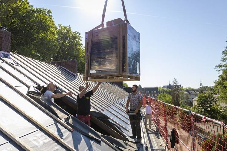 Die Projektpartner entwickelten daher einen neuen Ansatz, der als eine zukunftsweisende Musterlösung für den Wärmepumpeneinbau in dichtbebauten Arealen gelten kann: Die Wärmepumpen wurden im Dachgeschoss installiert. Dazu wurden die 290 kg schweren Geräte mit Schwerlastkränen durch das geöffnete Dach an die vorgesehenen Einbaustellen transportiert.