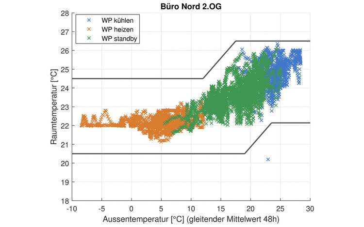 Eine wichtige Funktion zur Einsparung von Heiz- und Kühlenergie ist der Change-Over-Betrieb mit einer klaren Trennung zwischen Heiz- und Kühlbetrieb. Trotz minimalster Technik und breitem Komfortband der Raumtemperatur mit Werten von bis zu 26°C gab es laut Forschungsbericht keine Beanstandungen durch die Beschäftigten.