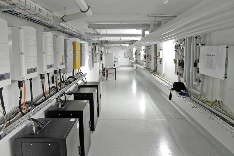 Bild 3: Technikzentrale in der Netto-Null-Energiehaus-Siedlung „Herzo Base“ in Herzogenaurach. Durch ein Demand Side Management konnte der Eigenverbrauch an PV-Strom um 21 Prozent gesteigert werden. Allerdings ist der Verbrauch der regelungstechnischen Einrichtungen mit einem Anteil von 10 Prozent vergleichsweise hoch.