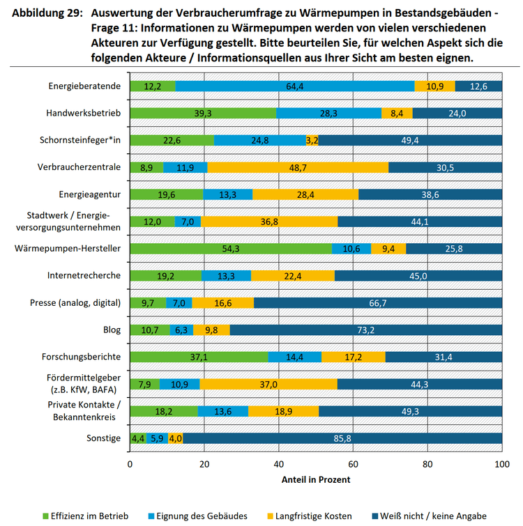 Als insgesamt wichtigste Infoquellen wählten die Befragten zum einen „Energieberatende“, insbesondere bezüglich der Eignung des Gebäudes. „Wärmepumpen-Hersteller“ (54 Prozent), „Handwerksbetriebe“ (39 Prozent) und „Forschungsberichte“ (37 Prozent) werden insbesondere für das Thema „Effizienz im Betrieb“ herangezogen. Verbraucherzentralen gelten als kompetente Infoquelle bezüglich der langfristigen Kosten (ca. 49 Prozent). Tendenziell eher schwach ausgeprägt ist die generelle Kompetenz-Einordnung der „Schornsteinfeger“.