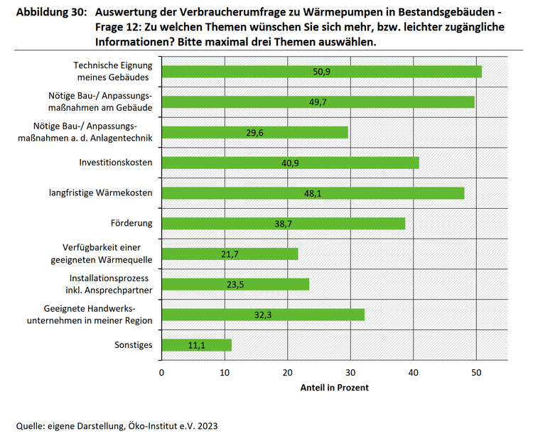 In Abbildung 30 ist dargestellt, zu welchen Themen sich die Befragten mehr bzw. leichter zugängliche Informationen wünschen. Hoher Informationsbedarf besteht demnach bei etwa 50 Prozent aller Befragten bezüglich der technischen Eignung des Gebäudes sowie der nötigen Bau-/Anpassungsmaßnahmen. Des Weiteren wünschten sich ca. 48 Prozent weitere Infos zu langfristigen Wärmekosten, ca. 41 Prozent zu den Investitionskosten und immerhin ca. 39 Prozent zu den Fördermöglichkeiten.