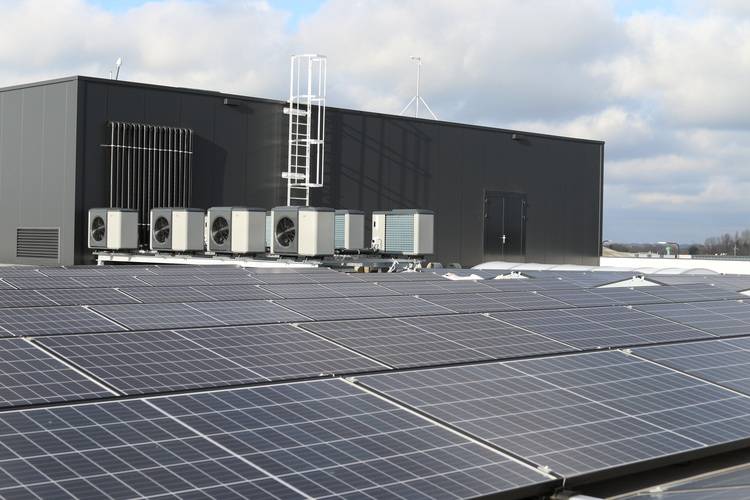 Acht Wärmepumpen sind für die größte Betriebseinheit des Gebäudes – der IT-Systemanbieter – auf einem Dachrahmen in einer parallelen Kaskadenanordnung zusammengeschaltet. So können alle Wärmepumpen gleichzeitig genutzt werden.