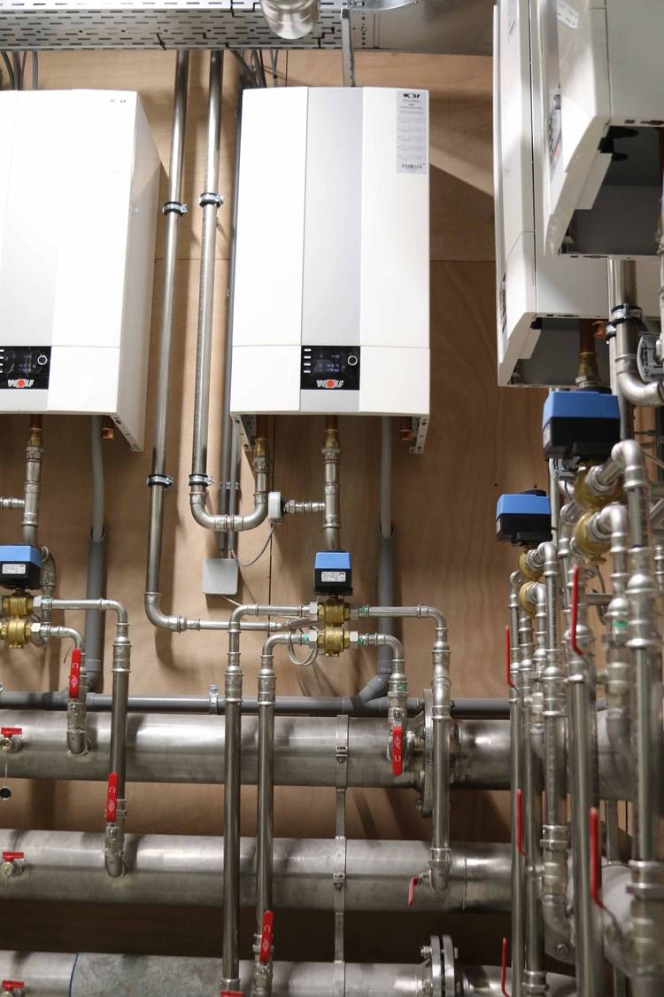 Dank des natürlichen Kältemittels R290 und des Wirkungsgrades der Wärmepumpen können hohe Vorlauftemperaturen (< 70°C) erreicht werden, ohne dass das elektrische Heizelement zum Einsatz kommt. Ein zentrales CRL Lüftungsgerät versorgt alle Gebäudeteile nach Bedarf mit gekühlter bzw. vorgewärmter, frischer Außenluft.