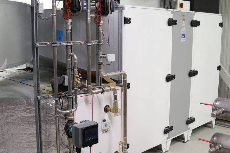 Das Lüftungsgerät CRL-iDH-9000 wurde in drei Modulen angeliefert und vor Ort montiert. Ein wasserführendes Register gleicht Temperaturdifferenzen aus der Wärmerückgewinnung aus. So kann die Zuluft im Sommer gekühlt bzw. im Winter erwärmt werden.