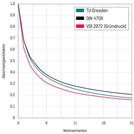 Freudenreich: Für die Ermittlung der Gleichzeitigkeit für die Warmwasserbereitung stehen unterschiedliche Möglichkeiten zur Verfügung. So kann auf die Normen VDI 2072 oder DIN 4708 oder die experimentell ermittelten Gleichzeitigkeiten der TU Dresden zurückgegriffen werden. Taconova setzt seit längerem auf die VDI 2072. In der VDI 2072 sind die Gleichzeitigkeiten in Abhängigkeit der Wohnungsanzahl mathematisch definiert. Demnach ist bei zwei Wohnungen von einer Gleichzeitigkeit von 0,62 auszugehen. Für fünf Wohnungen sinkt sie auf 0,35. Ab zehn Wohneinheiten kann man von einer Gleichzeitigkeit von 0,24 ausgehen.