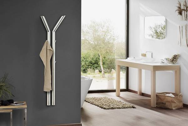 Y Tube präsentiert sich als schlanker Design-Hybrid aus Garderobe und Handtuchwärmer. Klare Linien, bestückt mit vier Haken, münden in einer Ypsilon-förmigen Ablage für Schals, Mützen oder Handtücher.