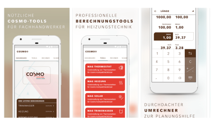 Die „COSMO APP“ bietet verschiedene Berechnungstools an, wozu neben der Thermostatventil-Einstellung vor allem die Ausdehnungsgefäß-Berechnungen für Heizung, Trinkwarmwasser und Solarthermie zählen.