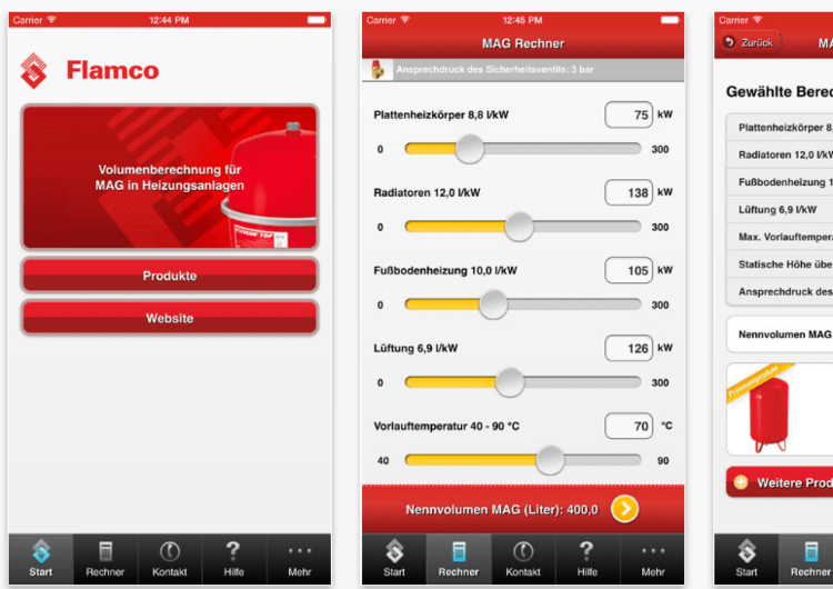 • Die „Flamco App“ für iPhone und iPod touch dient zur überschlägigen Dimensionierung von Membrandruckausdehnungsgefäßen für geschlossene Heizungsanlagen in Gebäuden nach EN 12828. Zum Funktionsumfang gehören u. a. eine automatische Produktempfehlung sowie die manuelle Auswahl aus passenden Alternativprodukten. Zu den Produkten selbst hält die App detaillierte Infos wie Montageanleitungen oder Auswahltabellen bereit.