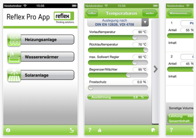 • Die „Reflex Pro App“ eignet sich zur mobilen Projekterfassung und um direkt vor Ort (im Heizungskeller) eine erste Beratung und Kalkulation mit hoher Detailgenauigkeit durchzuführen. Es lassen sich u. a. auch vorhandene Ausdehnungsgefäße nachrechnen, Vor- und Fülldruck definieren und Maßnahmen bezüglich Wasserhärte im Füll- und Ergänzungswasser gemäß VDI 2035 bestimmen. Vorteile: Verkürzt die Reaktionszeit beim Kunden und hinterlässt einen professionellen Eindruck.