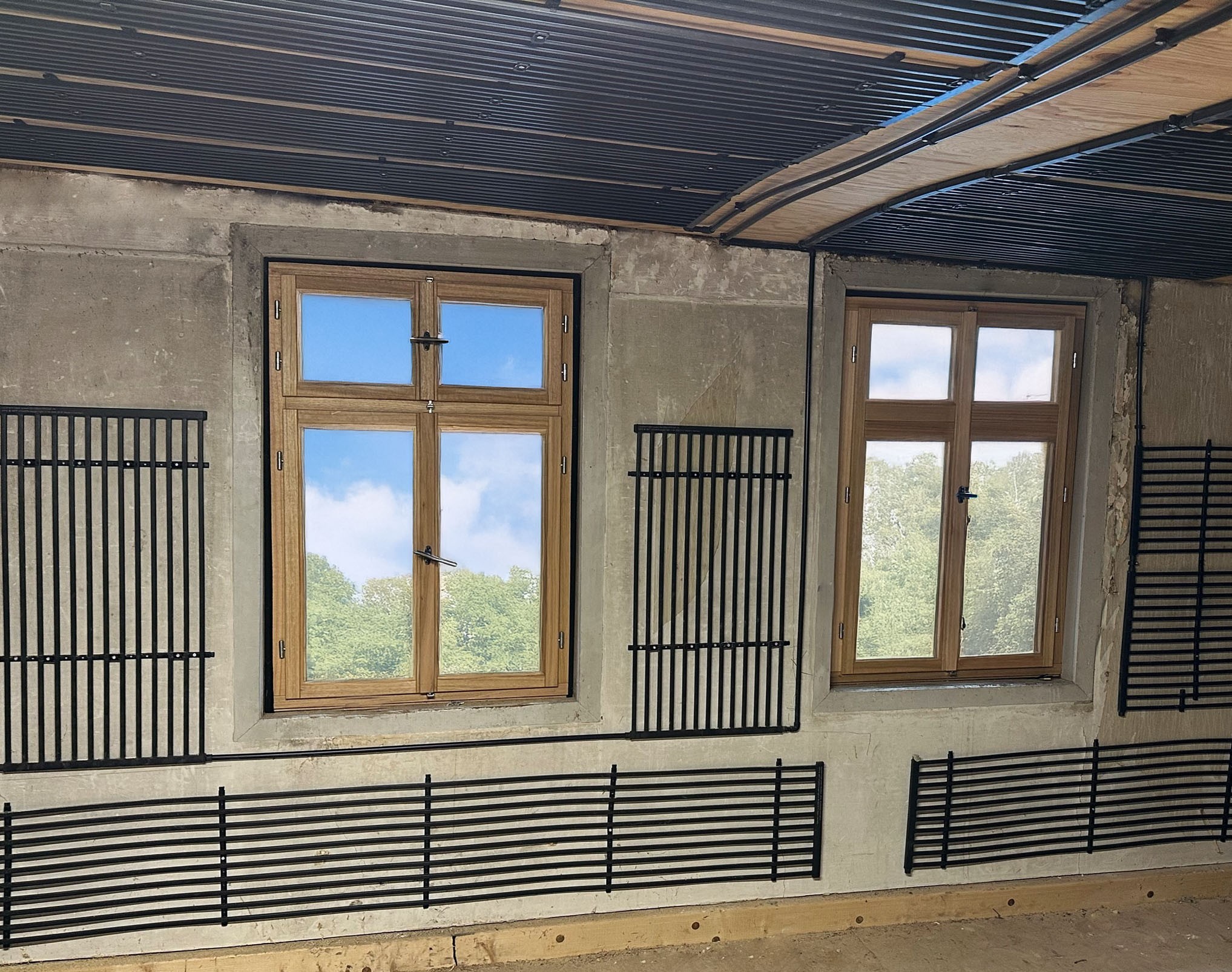 Zwei Holzrahmenfenster in einer Betonwand, darunter und seitlich schwarze Heiz- oder Lüftungspaneele - Beispiel für Fassadenintegration in der Gebäudetechnik.