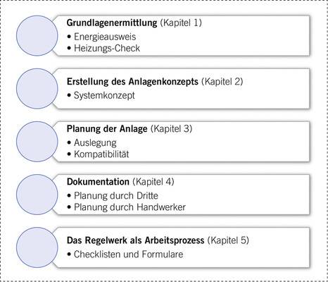 - Kapitel 2 beschreibt die Erstellung des Anlagenkonzeptes. Auch hier kann wieder nach Checkliste gearbeitet werden. Wie und wo wird Warmwasser bereitet? Wohin kommt der Wärmeerzeuger? Gibt es Faktoren, die bestimmte Lösungen von vornherein ausschließen?