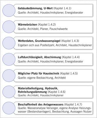- Kapitel 1 thematisiert die Grundlagenermittlung. Hier wird beschrieben, welche Daten für die Planung erforderlich sind und woher sie kommen. Dazu gehört zum Beispiel der U-Wert, der für die Heizlast benötigt wird. Kapitel 1 ist informativ. Das bedeutet, es muss nicht zwangsweise so gearbeitet werden.