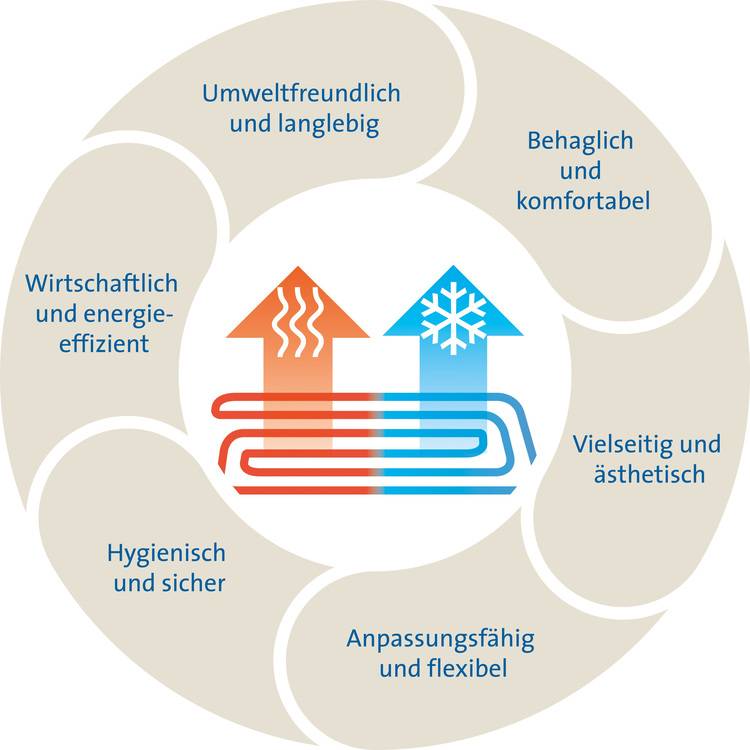 Analog zum Heizwärmebedarf reduziert sich im Zuge einer umfassenden energetischen Sanierung der thermischen Hülle auch die Gesamtheizlast des Gebäudes und damit auch die der einzelnen Räume. Dies bietet ideale Voraussetzungen zur anlagentechnischen Umrüstung auf ein Niedrigtemperatursystem mit Flächenheizung/-kühlung.