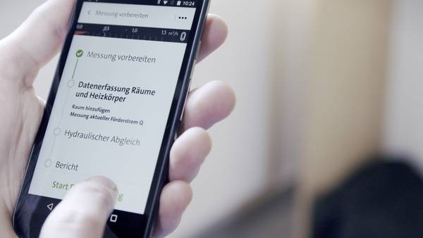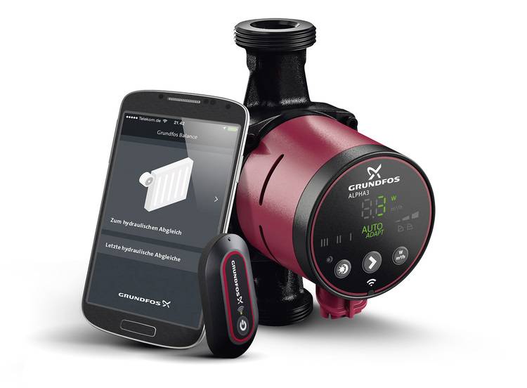 Erforderlich für den hydraulischen Abgleich ist das Pumpenmodell Alpha3, das Lesegerät Alpha Reader und die App Go Balance. Die Betriebsdaten der Pumpe werden mit dem Reader ausgelesen und per Bluetooth-Signal auf ein Smartphone oder Tablet übertragen. Die App ermittelt damit den Volumenstrom bei offenen und geschlossenen Ventilen und führt den Benutzer schrittweise durch den Abgleich.