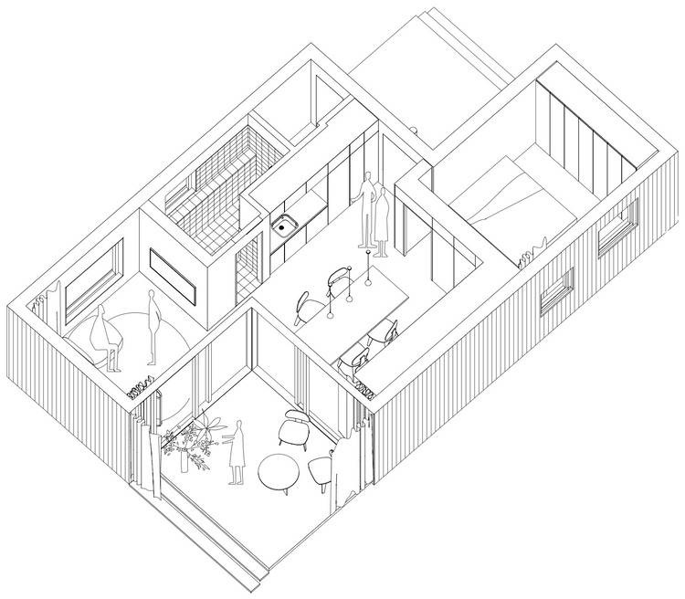 Schöpfer der T2-Tiny Houses in Harsewinkel ist das Warendorfer Unternehmen livingunits. T2 ist ihr erstes Modell seriellen Bauens kleiner, eingeschossiger Fertighäuser. Sie werden in Holzrahmenbauweise in Hallen komplett vorgefertigt, in zwei Modulen per Schwertransport zur Baustelle geliefert und dort vor Ort binnen weniger Stunden zusammengefügt. Einen Dachstuhl gibt es nicht. Bislang wurden die Häuser im KfW-55-Standard errichtet, doch mit dem Auslaufen der KfW-Förderung für diesen Baustandard Ende Januar dieses Jahres werden die in Zukunft gebauten T2 nun auf KfW 40 umgeplant. Auf den 47 m2 Nettofläche sind die Bereiche Schlafzimmer, Küche, Bad, Homeoffice und Wohnzimmer untergebracht. Dazu kommt ein Außenbereich in Form einer kleinen Terrasse.