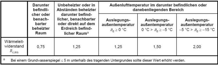 Energieberatungs- und Planungsbüros haben die Aufgabe, die Dämmschichten insbesondere im Bereich der beheizten und gekühlten Fußbodenkonstruktionen entsprechend den gesetzlichen Vorschriften und Normen richtig auszuwählen und zu dimensionieren. Für die Flächenheizung und -kühlung in Gebäuden mit normalen Innentemperaturen gilt die DIN EN 1264-4 mit den in der Tabelle (s.o.) festgelegen Mindest-Wärmeleitwiderständen für die Dämmschicht unter der Heiz- und Kühlebene.